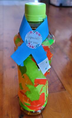 あとは、ペットボトルの飲み物にも「青いネクタイ?リボン?」が・・・ついていますね。