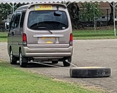 タイヤをひいて・・・運動場の整地をしているところでした。