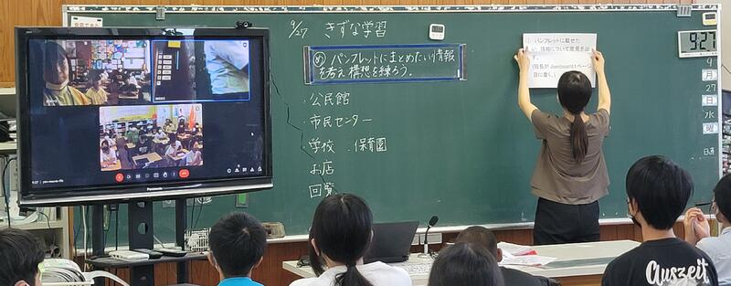 2校3クラスの児童からは、パンフレットに載せる情報や配布する場所、今後の3クラスの交流活動・・・といった内容が意見交換され、マイクとTV画面を通してですが、お互いの声や表情を確認し、志和池小学校の先生の説明や指示を聞きながら授業が展開していきました。