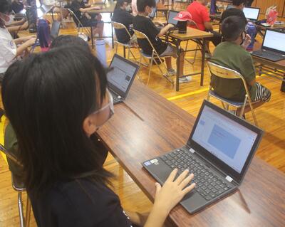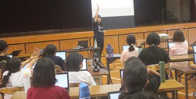 本市教育長も参加してのオープニングの後、さっそく一人一台のタブレットを用いた講習やレクリエーション、