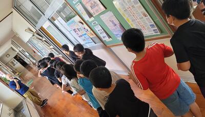 ご覧のとおり、体育館が合同授業の教室になっています。なかなか見られない学習風景です。