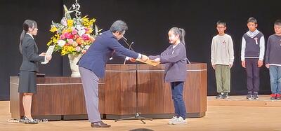 これは、これまで(過年度も含む)の日頃の努力や取組について、市内小中学生の中から、善行部門(個人や団体)、文化部門(個人や団体)に分けて贈られる賞です。今年度は73の個人及び団体に送られました。