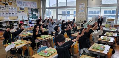 給食時間の6年生との交流は何としても続けたい・・・・なおかつ、感染予防のため直接交流をさけ、飛沫感染を防ぐということからこのようなオンラインという形で続けられています。