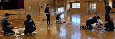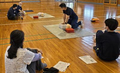 その使い方も含め、胸骨圧迫をする心肺蘇生法についても、都城消防局の方の御指導の下、教職員で研修しました。