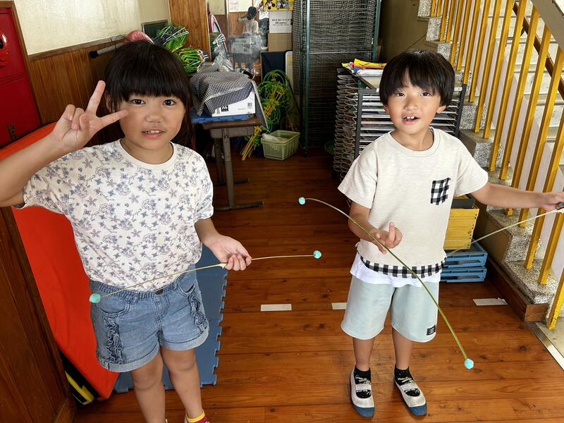 やじろべえ、紙でっぽうの完成です! 作品を手にとても満足そうですねヽ(^o^)丿
