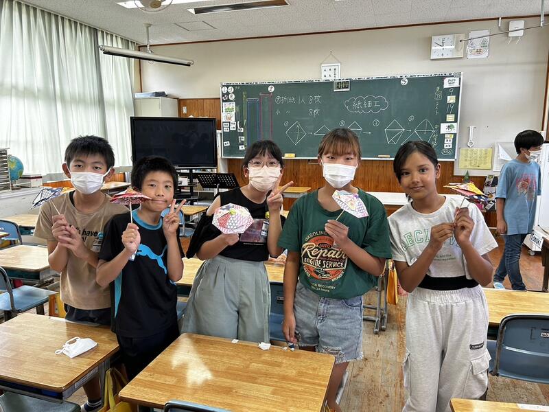 はい、出来上がった作品と一緒にピース!(^^)! 和紙できれいな傘の飾り物が完成しましたー!
