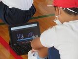 マット運動で開脚前転や開脚後転に挑戦しました。端末でお手本になる動画を見たり、自分の運動を振り返ったりしました。