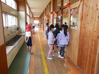 1年生が生活科で「学校探検」をしました。班ごとに、順番に各教室を回ります。職員室や保健室などでは、先生に質問する時間が設けられており、ドキドキワクワクの学校探検でした。