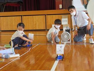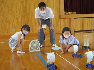 3年生が理科の時間に、送風機を使って風の力で車を走らせました。送風機を「弱」「強」にして、車が走る距離を比較しました。子ども達からは、その違いに驚きの声があがっていました。