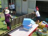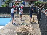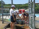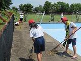 6年生がプール掃除をしました。天気がよく暑い中でしたが、水の冷たさを感じながら熱心に掃除をしていました。