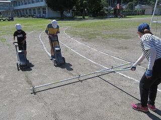 運動会の団分けに向け、100m走の記録をとるために、体育委員会の子ども達がラインを引きました。9月の学校行事の準備が始まっています。