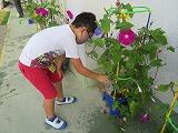 1・2年生は、朝の活動で、育てている植物のお世話をしています。1年生のアサガオはきれいな花を咲かせました。2年生のミニトマトも、随分、大きくなりました。