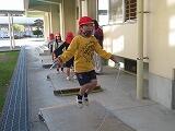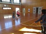 写真は、1年生の体育の授業の様子です。なわとび練習用のジャンピングボードを使って技を身に付けようと頑張っています。朝や昼休みには、多くの子ども達が、このボードを使って練習しています。長縄の連続跳びにも挑戦していますよ。