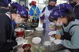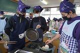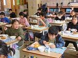 5年生が調理実習をしました。ガスコンロでご飯を炊き、みそ汁は煮干しで出汁をとる本格的なものです。向かい合って試食をする際は、パーティションを使用しています。(透明で見えにくいですが)