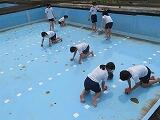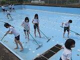 6年生がプール掃除をしました。天気がよく暑い中でしたが、水の冷たさを感じながら熱心に掃除をしていました。
