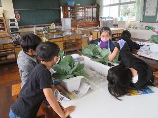 3年生が理科の時間に、チョウのたまごを観察しました。キャベツの葉の裏を、ルーペを使ってよく見ると・・・「たまごが、ありました!」という声が、あちこちからあがっていました。