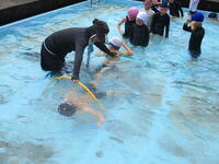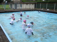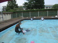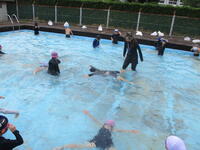 1学期もあとわずかとなり、学年ごとに本年度のプール納めを行っています。7/18は1年生が最後の水泳学習でした。水泳学習が始まったときは水を怖がる児童もいましたが、プールに入るたびに水に慣れ、いろいろなことができるようになりました。今日は、ワニさん歩きや貝殻拾い、伏し浮き、輪っかくぐりなどをして水遊びを楽しみました。最後に、体育着と体育館シューズを着けて着衣泳を行いました。水泳着のときと衣服や履き物を身に着けたときの違いについて「服が重い」「歩きにくい」などの声が上がり、その違いに驚いていました。夏休みの水遊びにも十分注意するように指導しました。