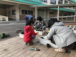 校長先生が育ててくださっている卒業式の花の苗を校長先生となかよし学級のみんなでプランターに植えかえました。