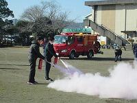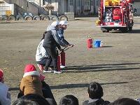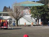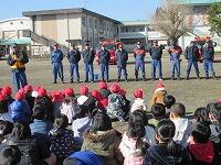 庄内小学校の火災の避難訓練には、庄内地区の消防団が参加してくださいます。