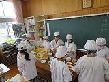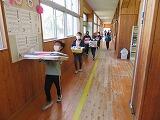 お楽しみの給食の時間です。6年生が給食当番をします。1年生は給食準備を静かに待っていますよ。この日の献立は「ごはん」「牛乳」「麻婆豆腐」「中華サラダ」でした。食べる前に、量の調節をします。