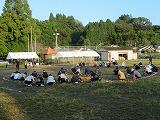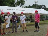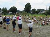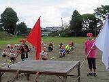 子ども達は、A・Bに分かれ、縦横2メートル間隔で並び、結団式が始まるのを待ちます。