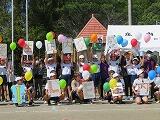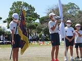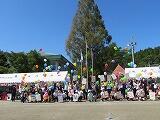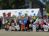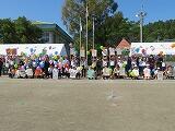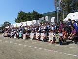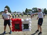 親子団技の後は、記念イベントとして、「地域 家族 友達 先生 庄内小に感謝 いつでもSMILE 庄内っ子」(27文字 6年生の人数)と書かれたボードを掲げ、風船を飛ばしました。風船が青空に映えて見事でした!