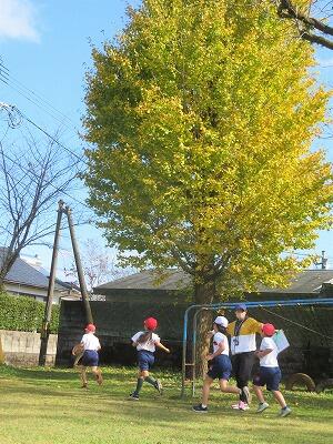 3年生が、黄色く色づき始めたイチョウの木の側を、学校周りの持久走コースへと走っていきます。