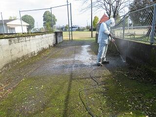 本校職員は、持久走記録会に備え、苔がついて滑りやすくなった道路を、高圧洗浄機で掃除しています。