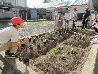 子ども達が学年の花壇に花の苗を植えました。学年によって、工夫を凝らして苗を植えているので、参観日にお越しの際、御覧ください。