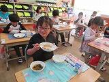 今日は、これに合わせ「都城産牛のサイコロステーキ」が出されました。子ども達の笑顔から美味しさが伝わってきます。