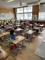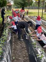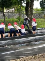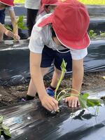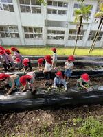 そして、5月18日(水)の2・3校時に1、2年生全員でいもを植えました!担任が空けた穴の中に上手に植えていました。今から秋の収穫が楽しみです。