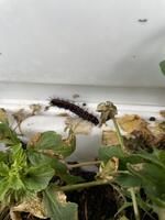 庄内小学校の玄関前でパンジーを育てていました。花の時期も終わったので植え替えをしようかと思っていましたが、いつの間にかツマグロヒョウモンの幼虫が活動している様子を発見しました。そして、いくつかサナギになっていました。そこで、成虫になるまで見守ることにしました。