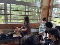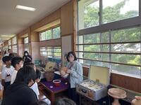 6年生を対象に、都城市埋蔵文化材課(通称マイブン)による社会科の出前授業を行いました。縄文時代や弥生時代の遺跡から出土した様々な土器や矢じりなどを見せてくださいました。また、田植えで使う田下駄なども紹介され、田植えを経験した児童達は、想像を膨らませて目を輝かせて聞いていました。また、菓子野町の遺跡から出土した人骨など、貴重な資料を目にして、遙か古代の庄内地区の人々の生活について考えていました。