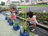 1年生が、アサガオの植木鉢に支柱をたてました。種をまき、水やりをして栽培してきたアサガオは、つるが伸び始めています。