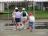 朝方、激しい雨が降りました。運動場には水がたまり、鏡のようになってテントや木々が映っていました。そのため、運動会予行練習は水曜日に延期しました。