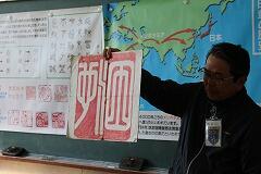 体験の始まりは、印鑑(印章)の深い歴史についての説明からでした。講師の先生からは、印鑑のルーツが紀元前4000年頃のメソポタミア文明にまでさかのぼり、シルクロードを経て中国から日本へと伝わってきたという壮大な話がありました。子どもたちは、普段何気なく目にしている印鑑が、そんなにも古い歴史と文化の流れを持っていることに驚きながら、熱心に聞き入っていました。