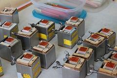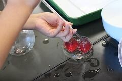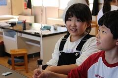 理科室から4年生の歓声と共に「撮れた?」、「もう一回見せて!」という興奮した声が聞こえてきます。 理科「ものの温度と体積」の学習におじゃましました。今日のテーマは「温度によって空気の体積(かさ)は変わるのか?」です。 ガラス管をつけたフラスコにゼリーを詰め、お湯で温めたり氷水で冷やしたりして、その動きを観察します。