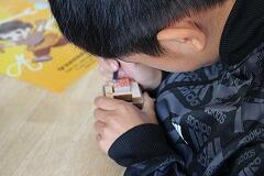 子どもたちの前に置かれたのは、印材となる石と、細い彫刻刀、そして印材を固定するための道具です。まずは、自分の名前を篆刻するための隷書の辞書を使って調べます。普段書いている文字と異なり、びっくりしている子どもたちもいました。次に、調べた名前の文字を紙に写し取り、印材に反転させて下書きします。この時点で左右逆になるため、子どもたちは頭を悩ませていました。そして、いよいよ彫刻の作業に入ります。