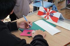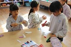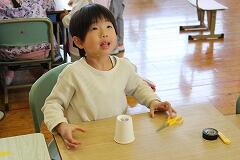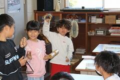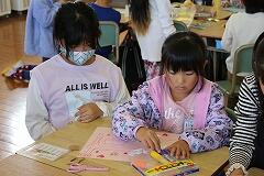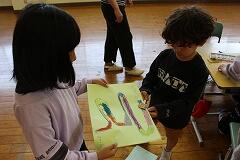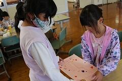 ◆楽しかったね! 2年生が「こうやってゴムをかけるとね、ほら。」と実演すると、1年生から「おー!」という驚きの声が。みんなで一緒にゴムの付け方を確かめながら、完成したカードを床に置いて、勢いよく飛び上がる様子に大喜びでした。「もう一回やってみよう!」と夢中になって遊ぶ姿が印象的でした。