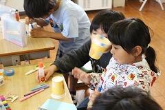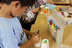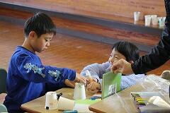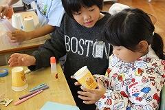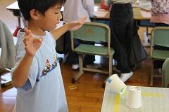◆楽しかったね! まずは、コップに可愛い絵やかっこいいマークをデザイン。写真のように、2年生が1年生の描いた絵を見て「わあ、上手にできたね。」と笑顔で声をかけています。そして、いよいよジャンプの瞬間!1年生が紙コップを手に持ち、「せーの‼」と手を離すと、「わっ、飛んだ!」とびっくり。高く飛ぶと、みんなで笑い合っていました。