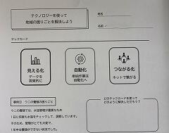 子どもたちは、①見える化(データを視覚的に)、②自動化(単純作業を自動化へ)、③つながる化(ネットでつながる) の3つのテックカード(テクノロジーの機能)を活用し、地域の課題を発見し、解決策を考える取り組みに挑戦しました。
