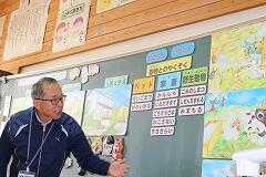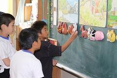 授業の中では、私たちの身近にいる動物を「ペット」、「家畜」、「野生動物」の3つのグループに分けて考えました 。 黒板にそれぞれの動物のカードを貼りながら、人間との正しい付き合い方や「約束」を確認していきます 。