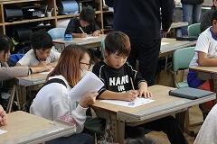 後半のワークシートに取り組む時間では、「動物との約束 自分ができること」について考えました 。 黒板に示された「かわいがる」、「のこさない」、「ごみのしまつ」などのキーワードを参考にしながら、自分ならどんな行動ができるか、鉛筆を走らせます 。