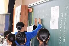 子どもたちは、「記号には読み方が同じで、形(意味)が違う漢字が入る」というルールに気づき、次々と正解の漢字を当てはめていきました。
