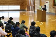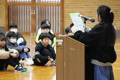 その後は、女の子による読み聞かせタイム。 ただ物語を読むだけでなく、「『そり』は英語で何て言うかな?」とクイズを出す場面も。 「スレー(sleigh)!」と元気よく発音を真似する様子に、日頃の外国語活動の成果がキラリと光っていました。