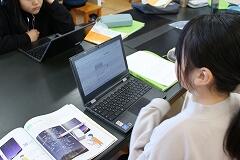 キーボードを叩く音だけが教室に響く、集中した時間。「一人一人が自分の考えを言葉にする」という作業が、ICTを使うことで非常にスムーズかつスピーディーに行われていました。友達の意見もリアルタイムで見ることができるため、「あ、その考えいいな。」という新たな気付きも生まれているようです。