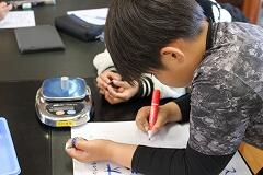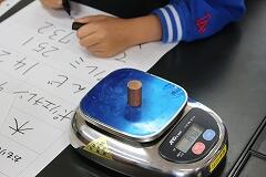 いよいよ、電子てんびんを使って正確な重さを量ります。 「1、2、3…」と、数字が変わるたびに息をのむ子どもたち。