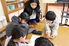 机を囲んでプリントを覗き込む子どもたちの表情は真剣そのもの。 「集合時刻は守れていたかな?」、「1列に並んで、安全に歩けていたかな?」と、班長さんが一人ひとりに問いかけながら、日頃の様子を丁寧に振り返っていました。