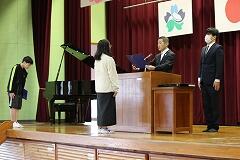 式の冒頭では、各学年の代表児童に「修了証」が手渡されました 。 校長先生の前に進み出る代表児童、そしてその場で起立する学年のみんな。満足げな笑顔や、少し緊張した真剣な面持ちなど、どの子もこの1年間の学びをやり遂げたという誇らしさが伝わってくる姿でした。