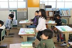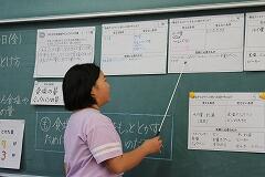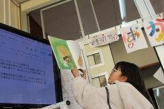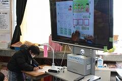 授業の中では、ICT機器(大型モニターと書画カメラ)も大活躍です。 一人の児童が教科書に書き込んだ考えをカメラで写すと、瞬時に大きな画面に映し出されます。